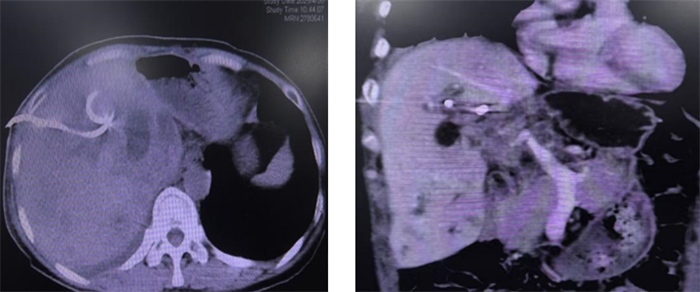 术前CT(正位、侧位)显示:肝门部胆管细胞癌并肝内外胆管扩张明显