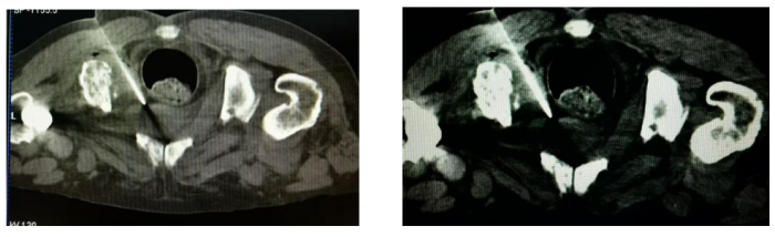全面评估之后,李岳勇主任带领团队决定充分利用科室CT模拟定位机,为李爷爷实施肿瘤科首例CT引导下前列腺肿物穿刺活检术。通过高分辨率CT影像可清晰地勾勒出前列腺内微小病灶的精确位置。在李岳勇主任的指导下,苏天海医生通过影像的精准导航,将细针稳稳地送入目标区域,成功获取了关键的组织样本。整个手术过程顺利,患者全程无明显不适感,术后生命体征平稳。