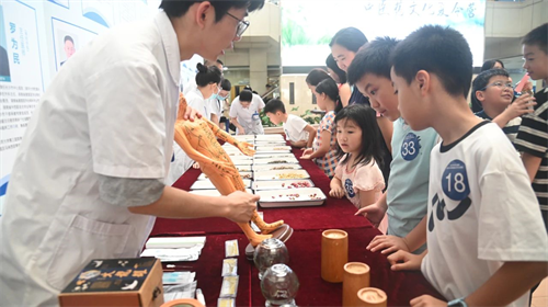 在识药辨性区,丁香、石菖蒲等药材散发着独特气息,学员们在药学专家指导下,通过“触、闻、观”的方式辨识药性;医器博览区陈列着传承千年的银针、精巧的艾灸盒等中医器具,向学员们彰显着古人卓越的诊疗智慧;经络探秘区里,学员们手持艾草锤,在中医指导下精准定位足三里、大椎等保健要穴。展览现场热闹非凡。