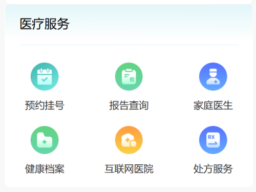 将功能清晰归类为“医疗服务”“其他服务”“健康科普”3大板块,界面更简洁,查找更高效。其中,“医疗服务”栏目涵盖预约挂号、报告查询、健康档案、家庭医生、互联网医院、处方服务等高频就医需求。