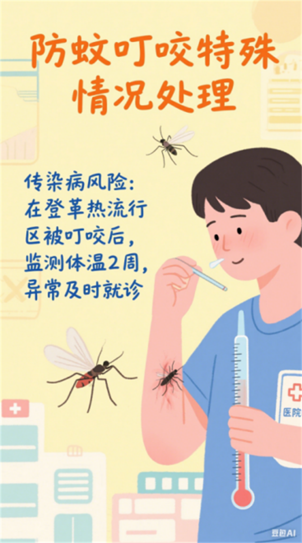 若出现呼吸困难、全身荨麻疹、头晕等严重过敏症状,立即拨打急救电话。在登革热流行区被叮咬后,监测体温2周,异常及时就诊。