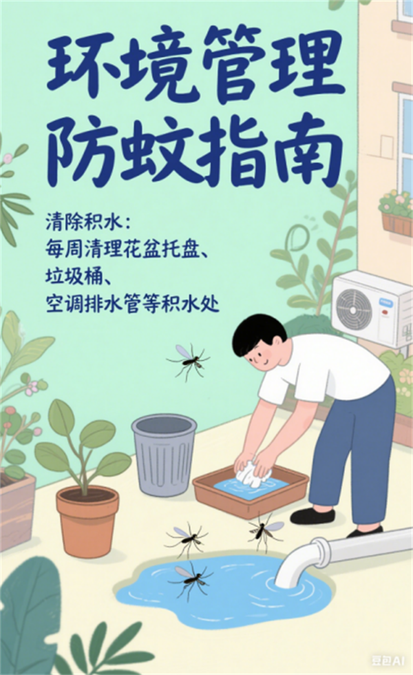3.环境管理:清除积水,每周清理花盆托盘、垃圾桶、空调排水管等积水处;水培植物定期换水,或放入食蚊鱼(如孔雀鱼);户外活动区可使用含氯菊酯的杀虫剂喷洒草丛。