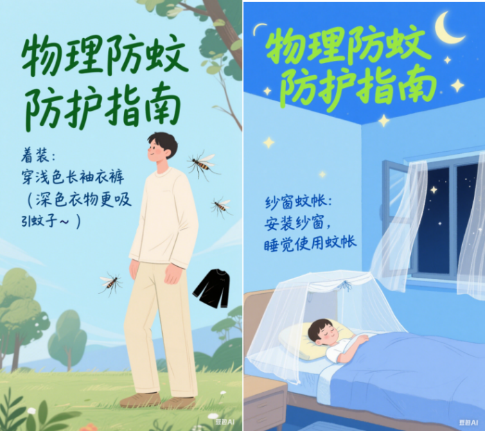 1.物理防护:尽量穿浅色长袖衣裤,深色衣物更吸引蚊子;家里安装纱窗,睡觉使用蚊帐;伊蚊活跃时段为日出后2小时、日落前3小时,外出活动时尽量避开蚊虫活动高峰期。