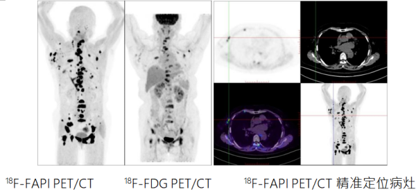18F-FAPI PET/CT:则如同一把精准的“钥匙”,专门锁定肿瘤微环境中的成纤维细胞激活蛋白(FAPI),对乳腺癌、胰腺癌等具有更早、更清晰的显示能力,甚至能揭示FDG显像阴性的病灶。